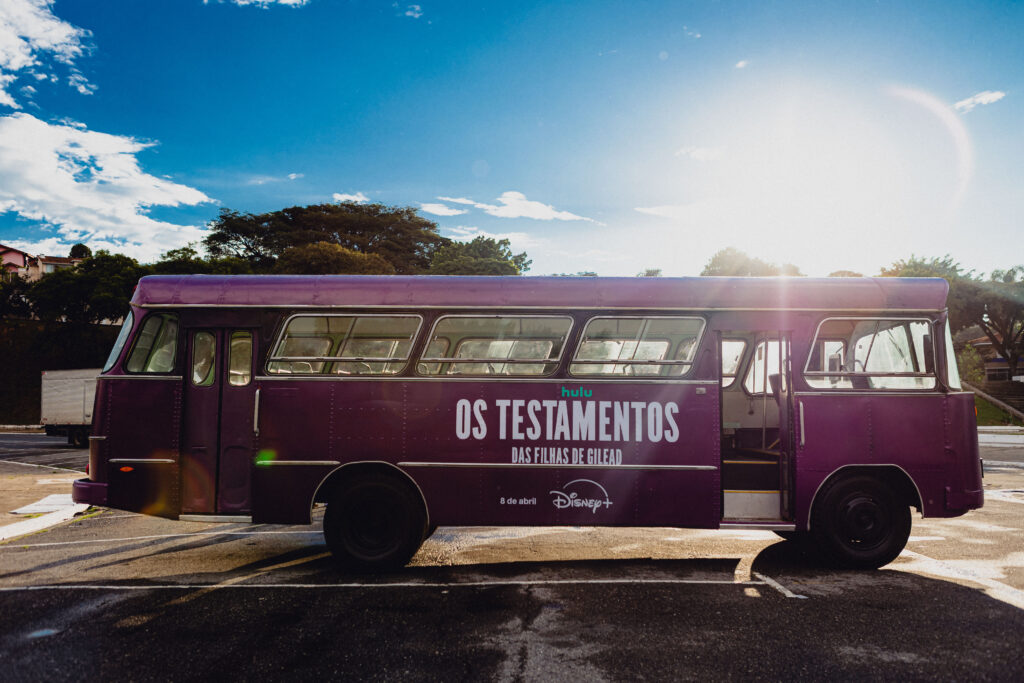 A campanha também levou a narrativa para as ruas. Um ônibus temático percorreu pontos estratégicos da cidade com intervenções performáticas. Durante a ação, personagens surgiam em fila, recriando momentos simbólicos da série. Dessa forma, o público teve contato direto com elementos marcantes do universo de Gilead.