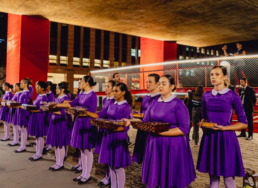 Outro ponto central foi o uso da torta de mirtilo como símbolo narrativo. Na trama, o item representa privilégio e controle dentro do regime. Por isso, durante as ativações, o público recebeu o alimento acompanhado da frase “Que possa a você nutrir”. Assim, a experiência reforça a crítica social presente na história.